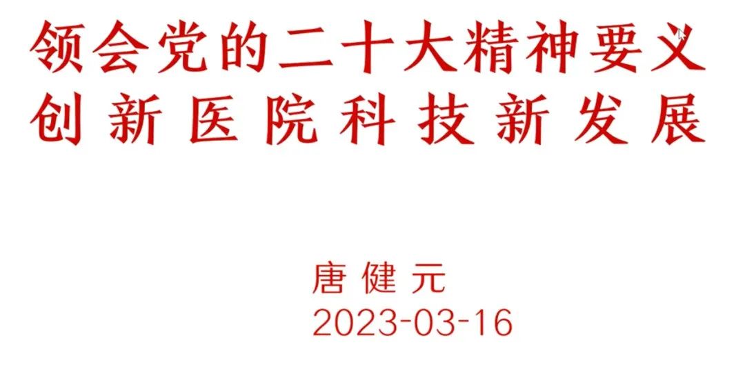 副院长唐健元以《领会党的二十大精神要义、创新医院科技新发展》为题进行授课,他提到医院全体干部、师生职工要把学习贯彻党的二十大精神与习总书记关于中医药工作的重要论述结合起来,切实提高政治站位,坚定必胜信念,提升中医药科技创新能力,持续强化服务意识,树立大历史观、大时代观。