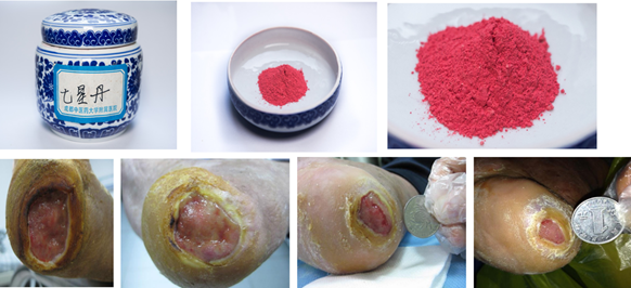 我科治疗皮肤慢性溃疡有体现川派文氏皮科特色的中医外治方法,如皮粘散、七星丹、紫草油、蛋黄油、10%黄柏溶液、漏芦猪蹄汤等,通过辨溃疡阴、阳证之不同,应用洗、敷、掺等上药技能并结合超声清创机、红蓝光治疗仪、微波治疗仪等非药物治疗治疗慢性溃疡效如桴鼓。